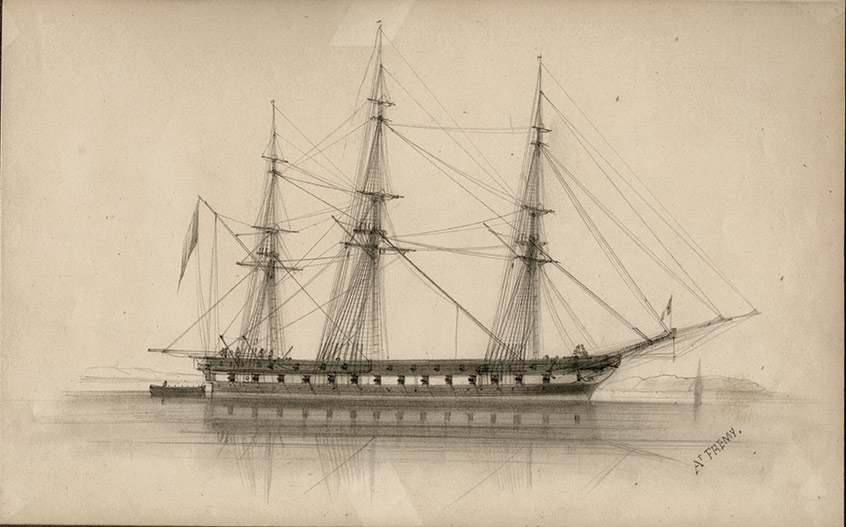 Dessin à la mine de plombDessin à la mine de plomb, signé en bas à droite. [XIXe siècle] ; 19 X 30 cm. Dessin représentant un vaisseau de guerre au mouillage.