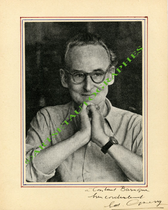 Photographie autographe signée, dédicacéePhotographie signée, dédicacée au peintre Constant Baruque. Photographie (retirage), en noir et blanc, le représentant de face. Sans date ; 140 x 190 mm, collée sur un support cartonné de 200 x 250 mm. « À Constant Baruque, bien...