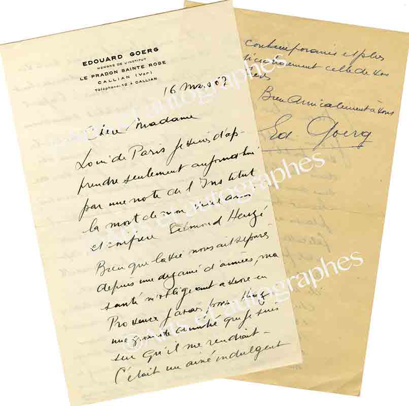 Ensemble de 2 lettres autographes signéesEnsemble de 2 lettres autographes signées :— adressée au peintre Edmond Heuzé. Sans date [1955] ; 1 page in-8°. « Je viens d’apprendre par la voix publique votre élévation dans la Légion d’honneur. J’en suis amicalement,...