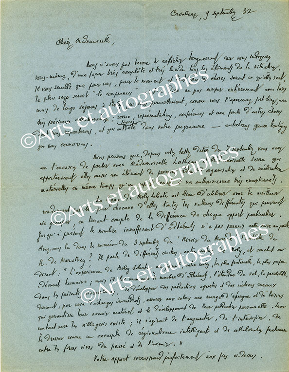 Lettre autographe signéeLettre autographe signée, adressée à Madeleine Israël. Cavalaire, 9 septembre 1932 ; 1 page 1/2 in-4°. Intéressante lettre, très dense, axée sur l’effet de Moly-Sabata. « Il nous semble que pour vous, pour le moment et tant que...