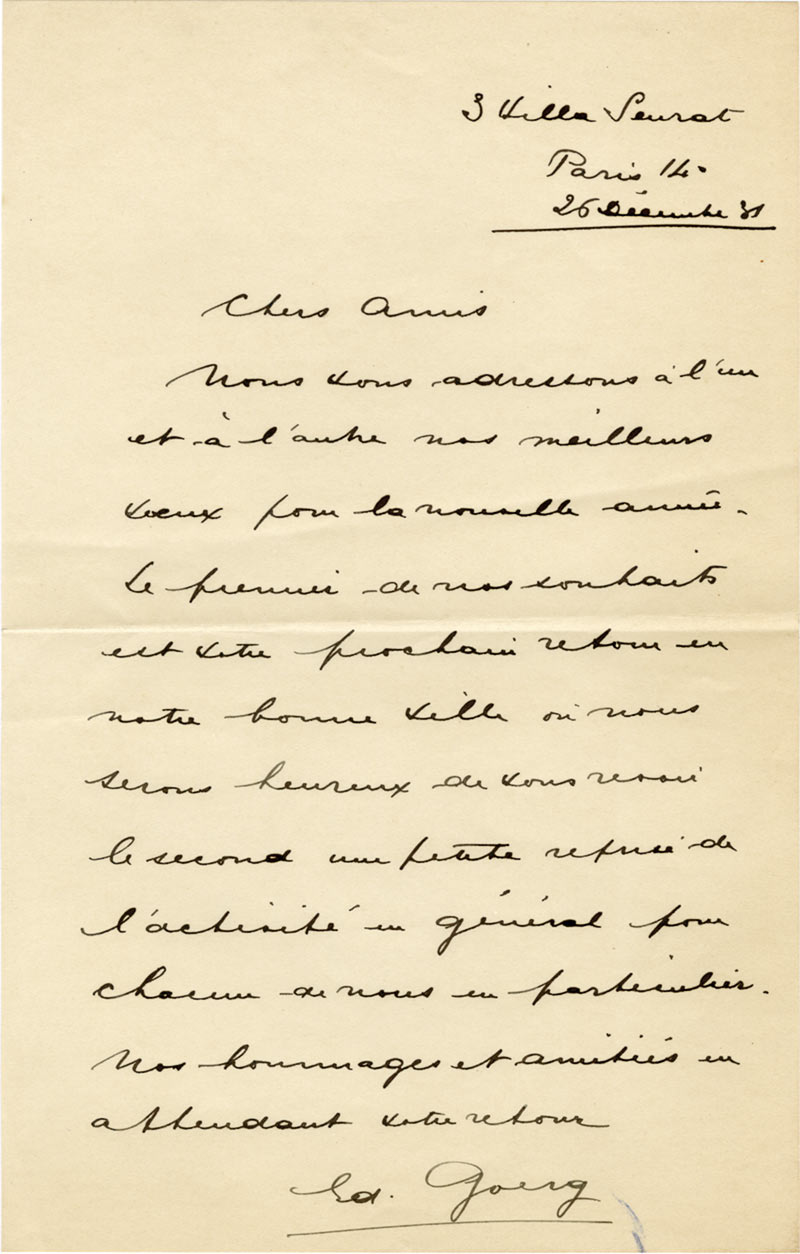 Lettre autographe signéeLettre autographe signée. Sans date ; 1 page in-8°. « Nous vous adressons à l’un et à l’autre nos meilleurs voeux pour la nouvelle année. Le premier de nos souhaits est votre prochain retour en notre bonne ville où nous serons...