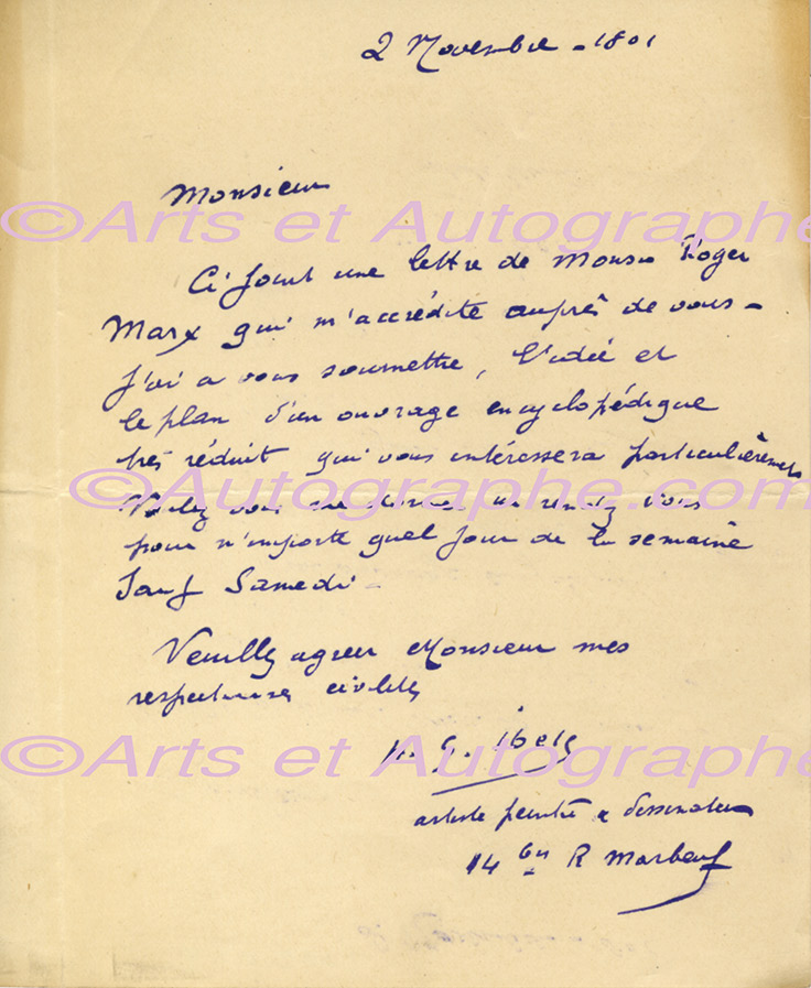 Lettre autographe signéeLettre autographe signée, adressée à Georges Moreau, directeur de la Revue Encyclopédique Larousse. Paris, le 2 novembre 1901 ; 1 page in-8°. « Ci-joint une lettre de Monsieur Roger Marx qui m’accrédite auprès de vous. J’ai à...