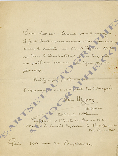 Lettre autographe signéeLettre autographe signée. Paris, 16 mars 1909 ; 2 pages in-8°. Il a lu dernièrement dans Le Figaro, que l’on songe à faire installer une réplique du buste de Reyer qui orne le foyer du grand théâtre de Marseille : « Je suis...