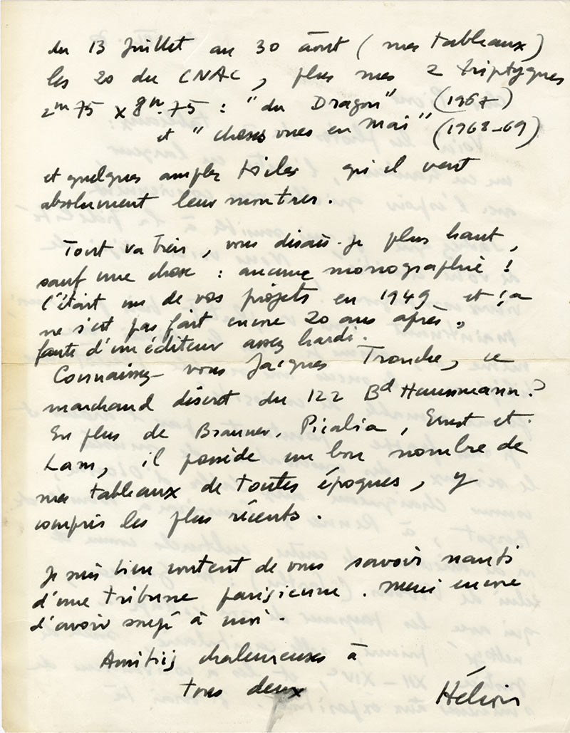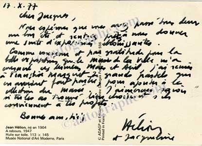 Carte autographe signéeCarte autographe signée, adressée à M. Lassaigne. 17 octobre 1977 ; 15 x 10,5 cm au dos d’une carte postale du Musée d’Art Moderne représentant sa toile « À Rebours ».« Nous espérons que vous avez passé tous deux un bon...