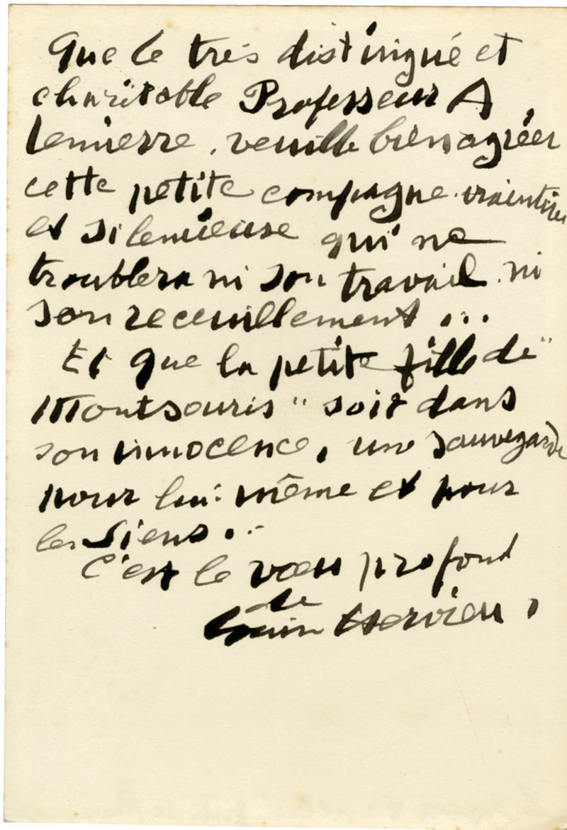 Carte autographe signéeCarte autographe signée, au dos d’une photographie la représentant très jeune et légendée « Louise la petite fille de Montsouris ».« Que le très distingué et charitable Professeur A. Lemierre veuille bien agréer cette petite...