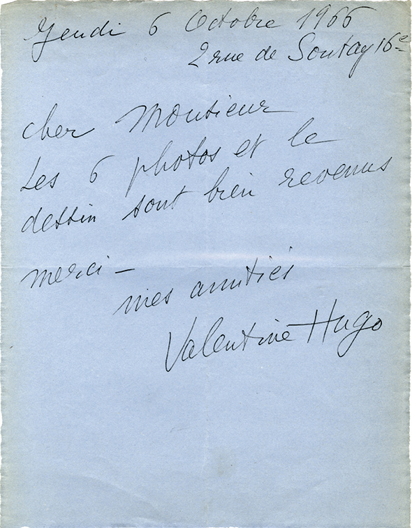 Lettre autographe signéeLettre autographe signée, adressée au critique dart Georges Boudaille. Paris, 9 octobre 1966 ; 1 page in-4°. « Cher Monsieur, les 6 photos et le dessin sont bien revenus. Merci. Mes amitiés, Valentine Hugo. »