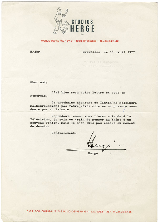 Lettre signéeLettre signée, adressée à M. Rouberol. Bruxelles, 14 avril 1977 ; 1 page in-4° à en-tête « Studios Hergé ». ...