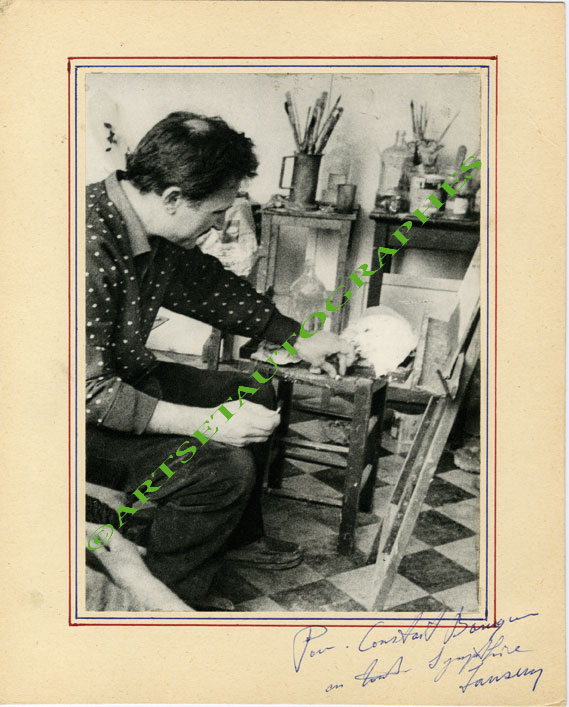 Photographie autographe signée, dédicacéePhotographie autographe signée, dédicacée au peintre Constant Baruque. Sans date ; 140 x 190 mm, collée sur un support cartonné de 200 x 250 mm. Photographie (retirage) en noir et blanc, le représentant dans son atelier. « Pour...
