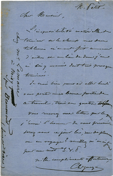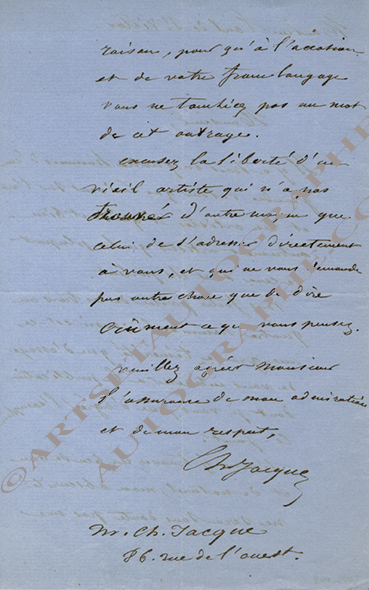 Lettre autographe signéeLettre autographe signée, adressée à M. Petit. Sans date ; 1 page in-8°. « L'impossibilité matérielle de terminer sur le champs mes deux tableaux m'en ont fait commencer d'autres et au lieu de deux, j'en ai cinq avancés dont trois...