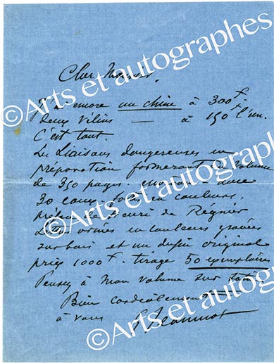 Lettre autographe signéeLettre autographe signée. Sans date ; 1 page in-8°. « Les Liaisons dangereuses, en préparation formeront un volume de 350 pages […] avec 30 eaux-fortes en couleurs, préface de Henri de Régnier. Lettres ornées en couleurs gravées...