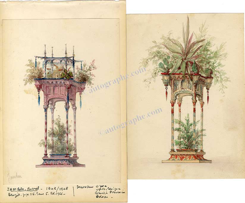 Ensemble de 2 dessins aquarellésEnsemble de 2 dessins aquarellés représentant des colonnes ouvertes, l’une surmontée d’un aquarium et l’autre d’une composition de plantes vertes. 19,5 x 14 cm, chaque.