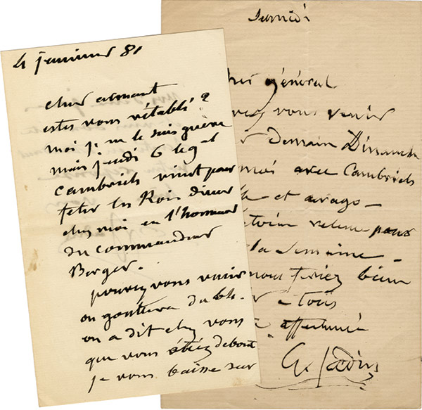 Lettre autographe signéeEnsemble de deux lettres autographes signées. 1881 ; 1 page in-8° et 1 page 1/2 in-8°. Sur une fête des rois en l'honneur du commandant Berger et sur le général Cambriels.