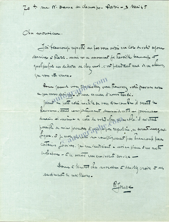 Lettre autographe signéeLettre autographe signée, adressée à J. Seigneur. Paris, 3 mai 1948 ; 1 page in-4°, enveloppe timbrée jointe. « J’ai beaucoup regretté ne pas vous avoir vu lors de votre retour dernier à Paris, mais en ce moment je travaille...