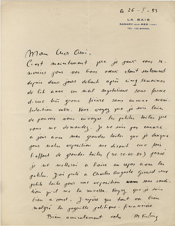 Lettre autographe signéeLettre autographe signée, adressée à un ami (le galeriste Armand Drouant ?). La Baie. Sanary-sur-Mer (Var) 26 janvier 1953 ; 1 page in-4°.Cest seulement maintenant quil peut le remercier de ses vux, ayant souffert cinq semaines...