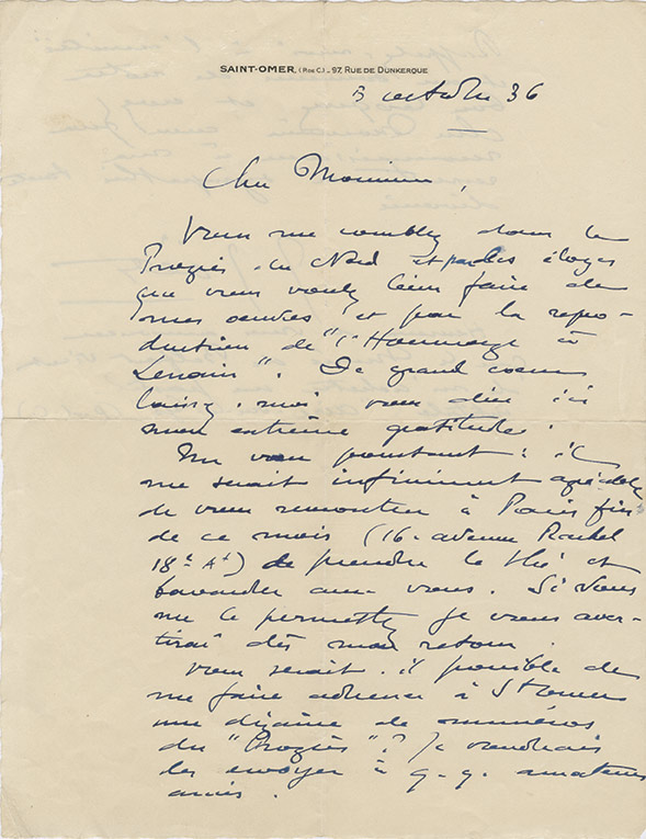 Lettre autographe signéeLettre autographe signée. Saint-Omer, le 5 octobre 1936 ; 1 page 1/2 in-4°. ...