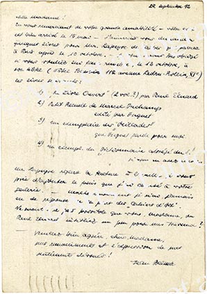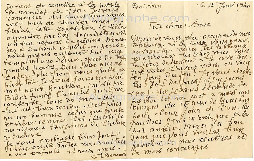 Lettre autographe signéeLettre autographe signée, adressée à Mme Duchâteau. Pont-Aven, 15 janvier 1940 ; 4 pages in-8°. « Merci de vous être occupée de mes tableaux. Si la caisse vous gêne, ouvrez-la, retirez les tableaux et accrochez-les chez vous. Vous...
