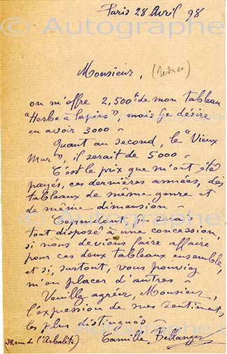 Lettre autographe signéeLettre autographe signée. Paris, 28 avril 1898 ; 1 page in-12. « On m’offre 2 500 f de mon tableau Herbe à lapins, mais je désire en avoir 3 000. Quant au second, le Vieux mur, il serait de 5 000. C’est le prix que m’ont été...