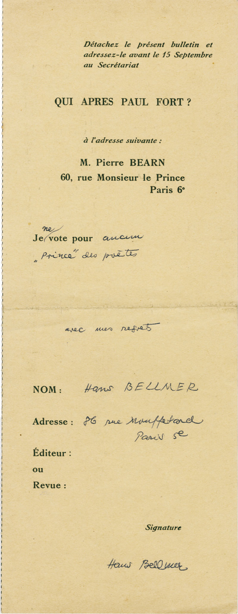 Pièce signéePièce imprimée avec mots autographes et signée. 9,5 x 24,5 cm. Bulletin de vote intitulé « Qui après Paul Fort ? », à retourner à M. Pierre Béarn. « Je ne vote pour aucun Prince des poètes. Avec mes regrets. » Sur le bulletin,...