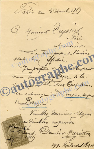 Lettre autographe signéeLettre autographe signée, adressée à M. Teyssier. « Paris, ce 5 avril 1889 » ; 1 page in-8°. « Le transport de l’Ondine s’est bien effectué. Je profite de la présente pour vous donner reçu de la somme de deux cents francs en...