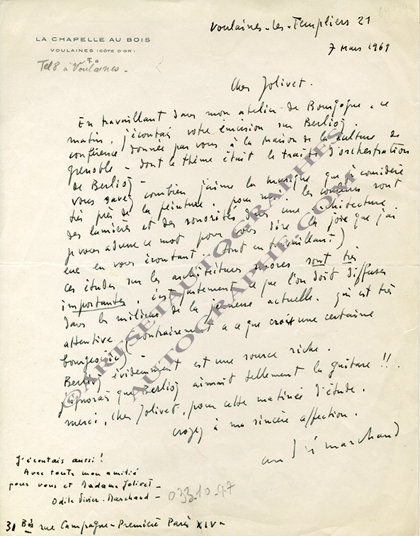 Lettre autographe signéeLettre autographe signée, adressée à André Jolivet. Voulaines-les-Templiers, le 7 mars 1969 ; 1 page in-4°.« En travaillant dans mon atelier de Bourgogne, ce matin, j’écoutais votre émission sur Berlioz. Conférence donnée par...