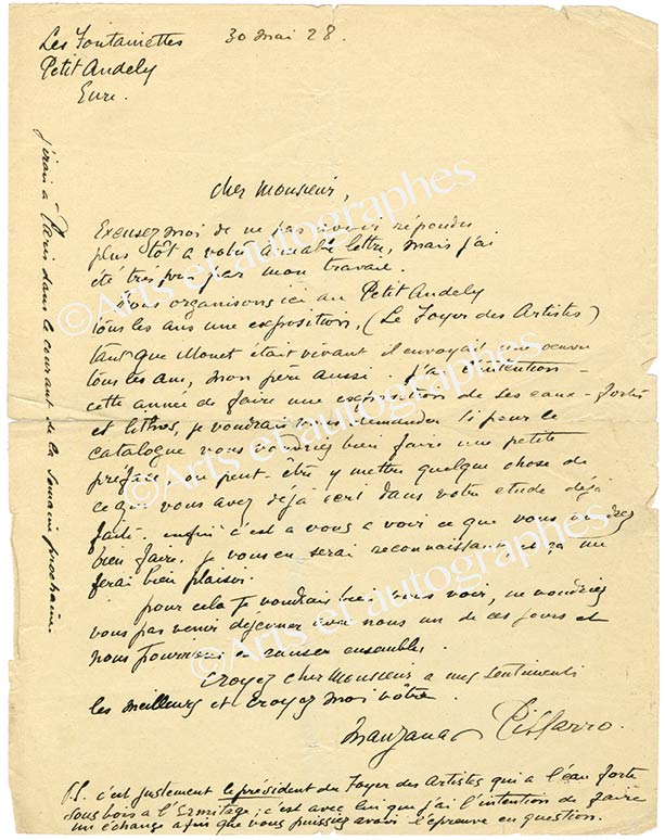 2 lettres autographes signées2 lettres autographes signées, [adressées à Claude Roger -Marx]. Petit-Andely (Eure) mai 1928 ; 1 page in-4° chaque (fentes et petites déchirures) :— 9 mai : au sujet d’une préface sur « les expositions du Foyer des Artistes...