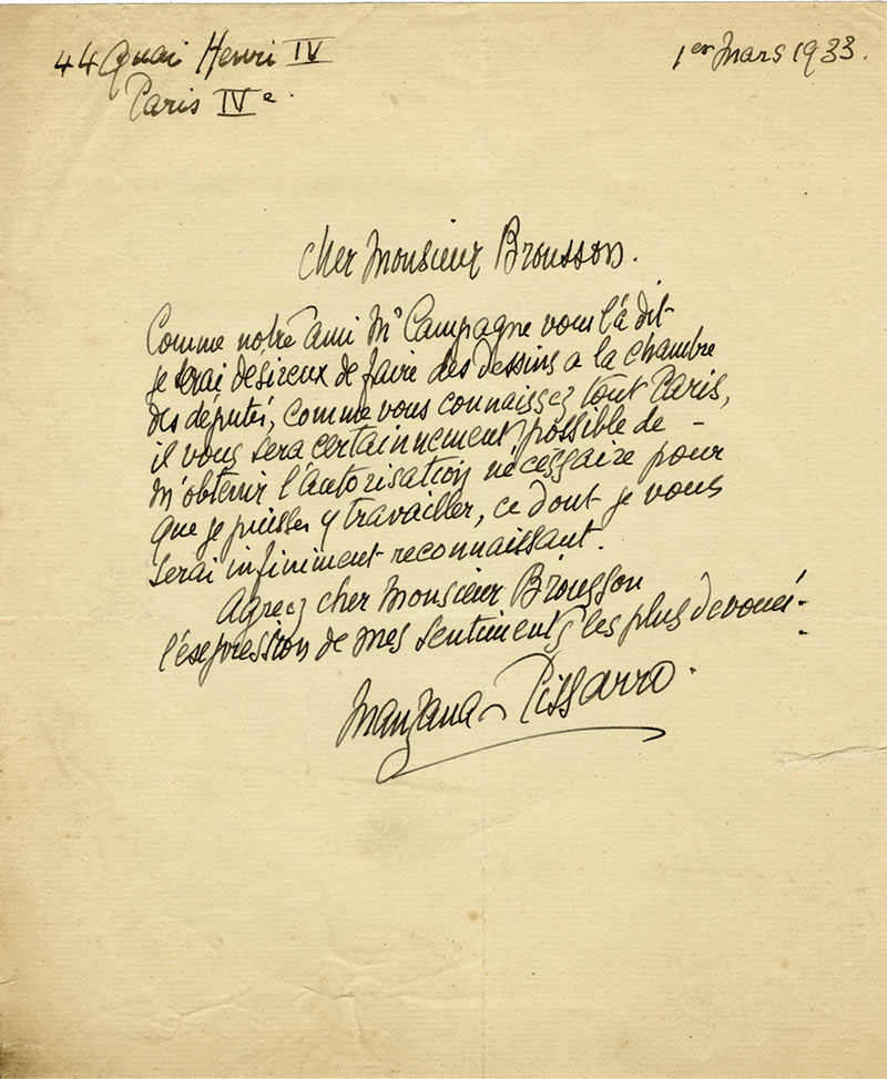 Lettre autographe signéeLettre autographe signée, adressée à Jean-Jacques Brousson. 1er mars 1933 ; 1/2 page in-4°, petite déchirure en marge. « Comme notre ami M. Campagne vous l’a dit, je serais désireux de faire des dessins à la Chambre des...