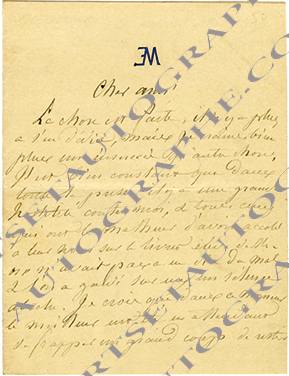 Lettre autographe signéeLettre autographe signée, adressée à un ami. Sans date ; 3 pages in-16. « La chose est faite et il n’y a plus à s’en dédire, mais je crains bien plus un insuccès qu’autre chose. Il est bien constant que dans toute la presse,...