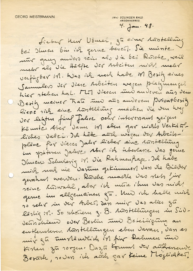 Lettre autographe signéeLettre autographe signée, adressée au galériste Alexander Vömel de Düsseldorf. Solingen, 4 janvier 1948 ; 2 pages in-4° sur son papier à lettre, en allemand, 2 perforations pour de classeur.« Je suis prêt pour une exposition avec...