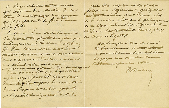 Lettre autographe signéeLettre autographe signée. Sans date ; 3 pages in-12.« Plus j’y pense (excusez cette obstination de plaider ce qui va être exécuté) plus je trouve que cette souche de cerisier à 40 centimes du sol a de la valeur. Comme c’est la...