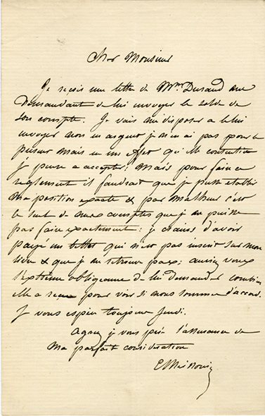Lettre autographe signéeLettre autographe signée. Sans date ; 1 page in-8°.« Je reçois une lettre de Mme Durand me demandant de lui envoyer le solde de son compte. Je vais me disposer à le lui envoyer non en argent, je n’en ai pas pour le présent mais en...