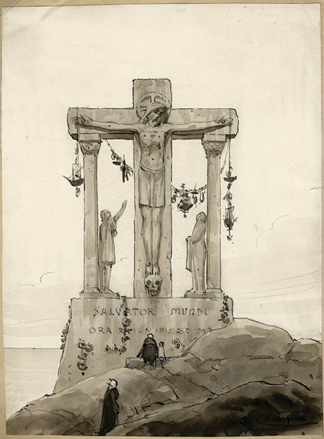 Lavis signé en bas à droite.Calvaire. Lavis signé en bas à droite. 22,5 x 16,5 cm. Collé sur un papier fort.