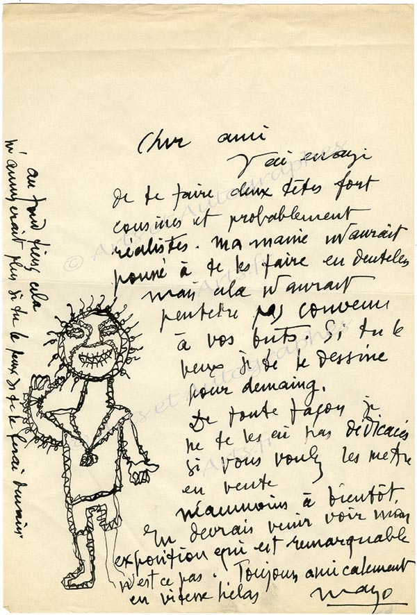 Lettre autographe signée avec dessinLettre autographe signée, adressée à A. Duchemin. Sans date ; 1 page in-4°, illustrée d’un amusant dessin, représentant un curieux personnage debout. « J’ai essayé de te faire deux têtes fort cousines et probablement...