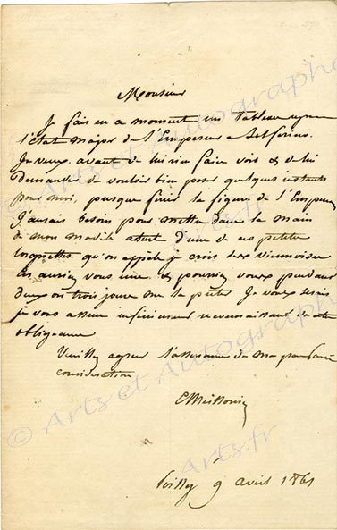 Lettre autographe signéeLettre autographe signée. Poissy, le 9 avril 1861 ; 1 page in-8°. « Je fais en ce moment un tableau representant l’état Major de l’Empereur Solferino. Je veux, avant de lui rien faire voir et lui demander de vouloir bien poser...