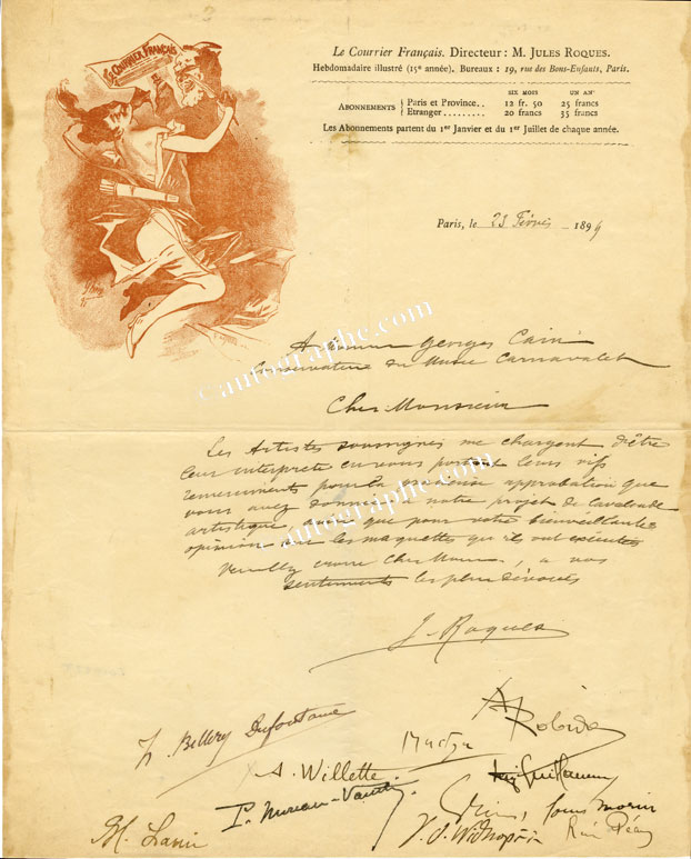 Pièce signée par des peintres et dessinateursPièce signée par des peintres et dessinateurs, en bas d’une lettre autographe signée de Jules Roques, directeur du Courrier Français, adressée à Georges Cain. Paris, le 23 février 1894 ; 1 page in-4° avec en-tête illustré par...