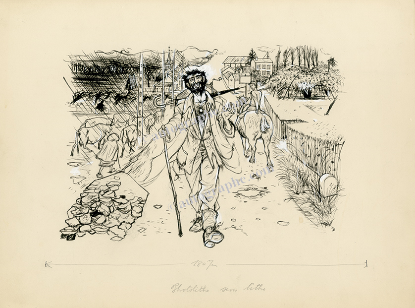 Ensemble de 6 dessins à la plumeEnsemble de 6 dessins originaux à la plume, rehaussés de gouache blanche. Sans date ; formats in-4° oblongues. Ces dessins ont servi à illustrer le livre de chansons scouts Voies Amies de William Lemit.
