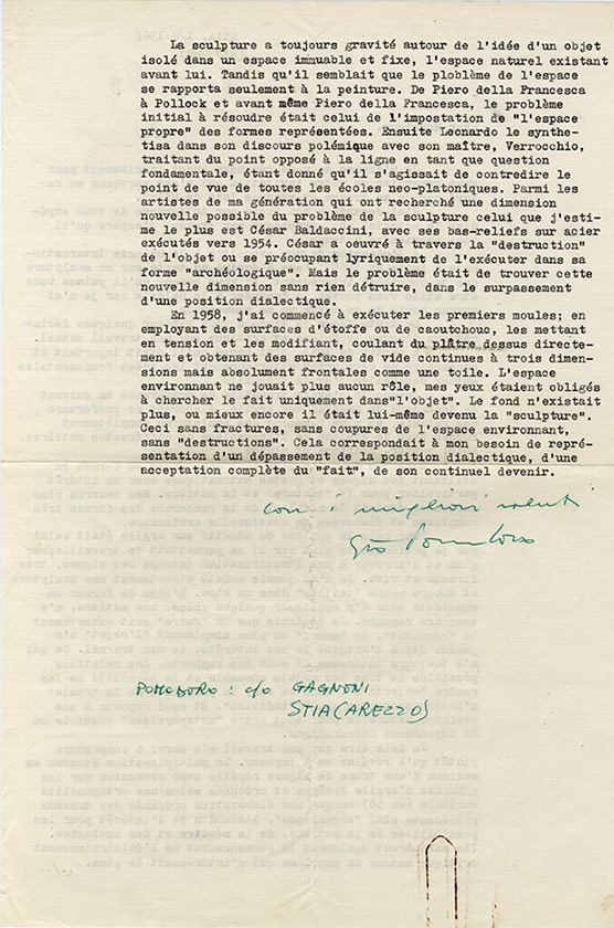 Lettre signéeLettre signée, adressée au critique dart Georges Boudaille. Stia, 1/8/1962 ; 1 page 1/2 in-4°, en français.Il est en vacances loin de Milan et a tardé à lui répondre.« À loccasion de mon exposition à la Galerie...