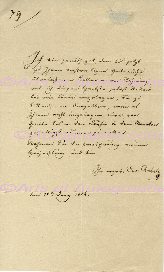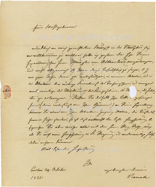 Lettre autographe signéeLettre autographe signée, adressée au peintre Bilotti. Berlin, 24 octobre 1832 ; 1 page in-4°, en allemand. Petit trou avec manque de papier dû au décachetage de la lettre, le mot absent figure sur le cachet. Rare.