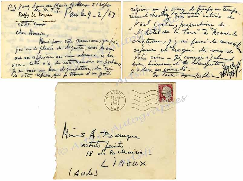 2 cartes autographes signéesEnsemble de 2 cartes autographes signées, adressées au peintre Constant Baruque. 2 pages in-16 oblongues (140 x 90 mm) chaque.— Saint-Aygulf, le 2 janvier 1961, enveloppe jointe. « Merci pour votre charmant dessin qui orne ma...