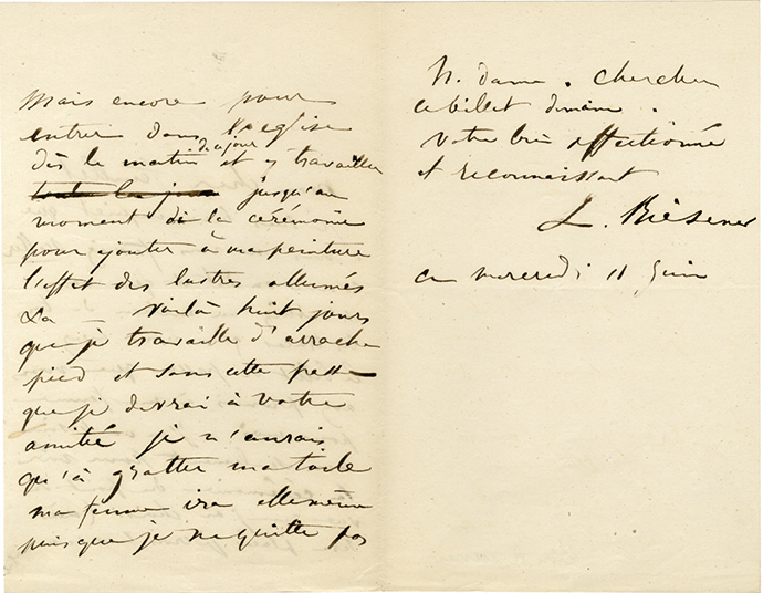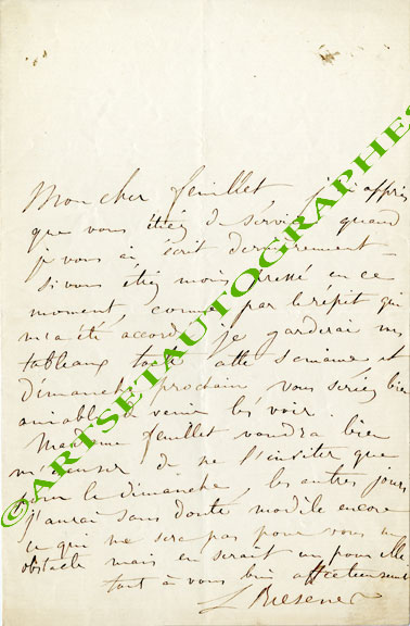 Lettre autographe signéeLettre autographe signée, adressée à Octave Feuillet. « Ce mercredi 11 juin » ; 2 pages 1/2 in-8°. « Je suis bien inquiet que vous ne vous fassiez sceller comme on dit et que vous n’oubliez au milieu de tous les tracas que vous...