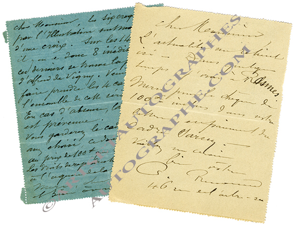 Ensemble de lettres autographes signées2 lettres autographes signées, adressées à Georges Moreau, directeur de la Revue Encyclopédique. 1899 ; 2 pages in-12. « Les six croquis publiés par L’Illustration sont marqués d’une croix. Sur les 14 croquis, il y en a donc 8...