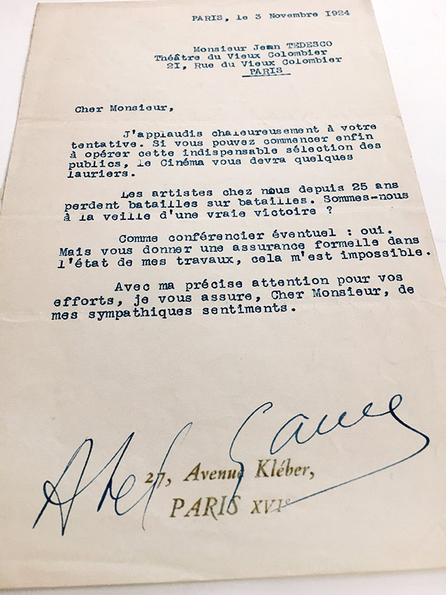 Lettre signéeLettre signée, adressée à Jean Tedesco du Théâtre du Vieux Colombier. Paris, 3 novembre 1924 ; 1 page in-8°. « J’applaudis chaleureusement à votre tentative. Si vous pouvez commencer enfin à opérer cette indispensable...