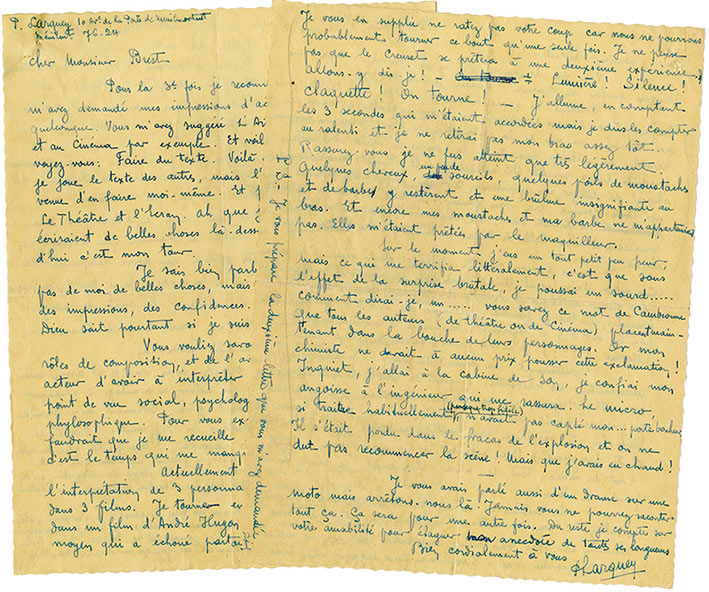 Ensemble de 3 lettres autographes signées, adressées au journaliste René BrestEnsemble de 3 lettres autographes signées, adressées au journaliste René Brest : Paris, le 5 janvier 1935 ; 2 pages in-4°. « Pendant les prises de vue de LOr dans ma rue, Préjean et moi devions provoquer une grosse explosion au...