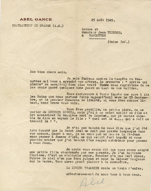 Lettre signéeLettre signée « Abel », adressée à M. et Mme Jean Tedesco. Paris, 25 août 1949 ; 1 page in-4° sur papier à son en-tête gravé. ...