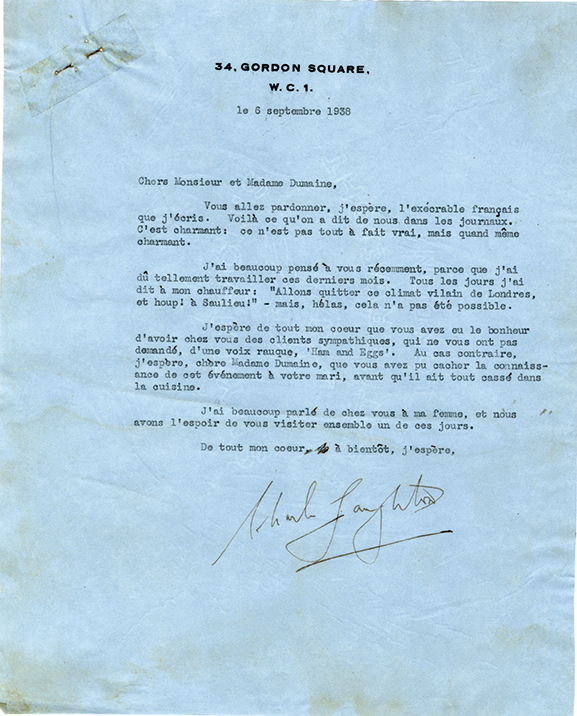 Lettre signéeLettre signée, adressée à M. et Mme Dumaine. 6 décembre 1938 ; 1 page in-4°, trace de ruban adhésif au dos en haut à gauche. En-tête gravé « 34, Gordon Square », en français. « Vous allez pardonner, j’espère, l’exécrable...