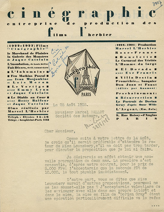 Lettre signéeLettre signée, adressée à Marcel Ballot. 25 août 1928 ; 1 page 1/4 in-4°, sur 2 feuillets. En-tête illustré « Cinégraphic — Entreprise de production des films L’Herbier ». Correspondance relative à la transposition au cinéma...