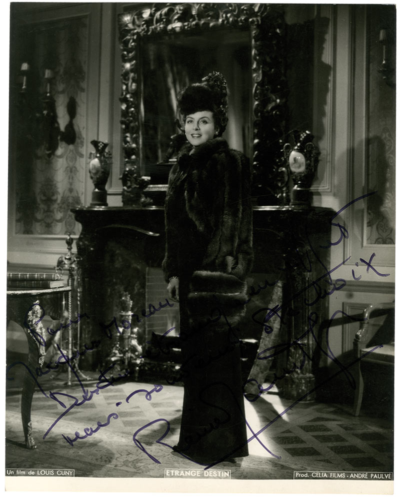 Photographie signéePhotographie signée. 28 X 22 cm. Portrait de l’actrice dans le film de Louis Cuny Étrange destin . Photographie des productions Celia Films.