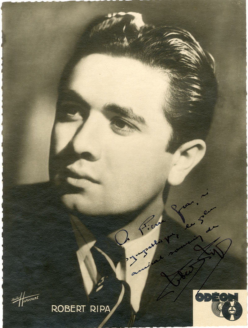 Photographie dédicacéePhotographie dédicacée. 22,3 x 16,8 cm. Photographie du studio Harcourt pour les disques Odéon.« À Pierre Gras, si sympathique, le plus amical souvenir de Robert Ripa. »