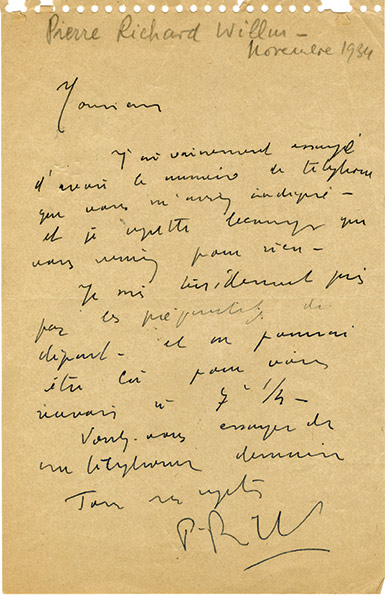 Lettre autographe signéeLettre autographe signée de ses initiales, adressée au journaliste René Brest. Sans date [novembre 1934] ; 1 page in-8°. « Jai vainement essayé davoir le numéro de téléphone que vous maviez indiqué et je regrette beaucoup...