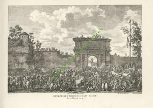 BATAILLES DU CONSULAT ET DE L’EMPIRE.ENTRÉE DES FRANÇAIS DANS MILAN [14 mai 1796]. Grande gravure représentant une scène de l’entrée des troupes françaises à Milan. Tirage du Second-Empire ; 390 X 255 mm sur un feuillet de 490 X 335 mm. Gravée par Masquelier d’après Carle Vernet. Tirée de l’Album des Campagnes des...