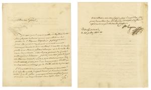 BEAUHARNAIS Eugène deLettre autographe signée, adressée au général Bertrand. Bade, Grand Duché, 23 juillet 1821 ; 1 page in-4°. Admirable lettre sur la mort de Napoléon. « J'ai appris par les papiers publics d'Angleterre et de France la perte douloureuse que nous avons faite en la personne de l'Empereur...